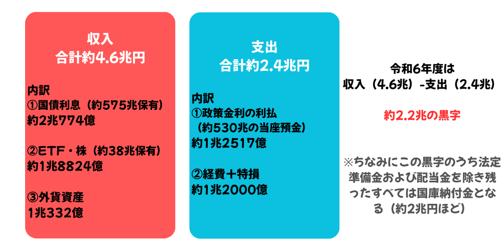 令和6年度においては収入が4.6兆、支出が2.4兆のため、2.2兆円の黒字となる。